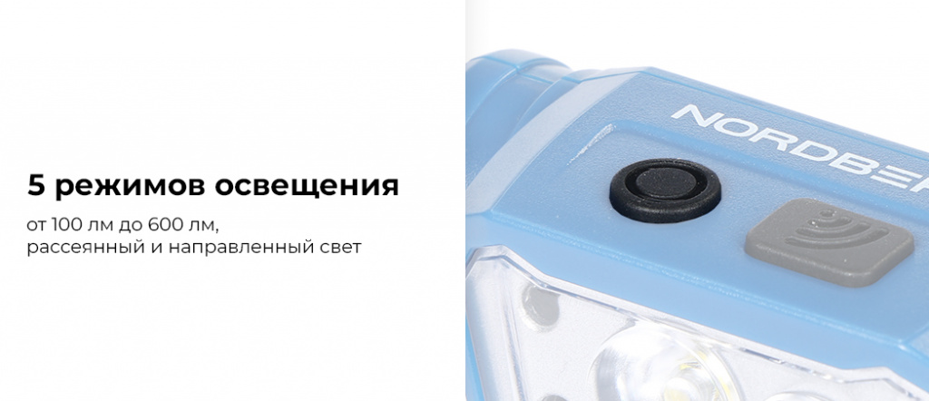 - Пять режимов освещения: от 100 лм до 600 лм, рассеянный и направленный свет.