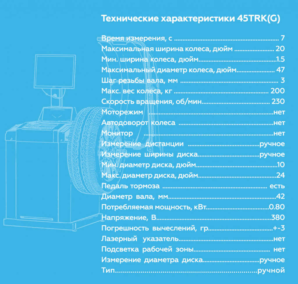 Балансировочный станок NORDBERG 45TRK(G) – специализированное оборудование для балансировки колес грузового транспорта, автобусов, а также другой техники с весом колеса до 200 кг. Только необходимый функционал обеспечивает простую и понятную работу и обслуживание станка