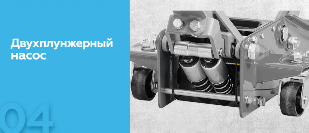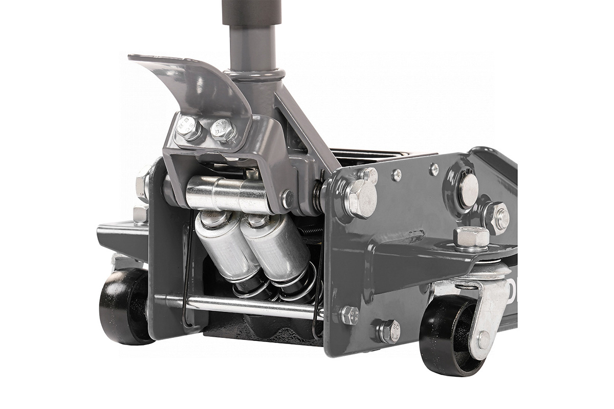 - Благодаря конструкции с маневренными колесами домкрат удобно перемещать по площадке и подкатывать под автомобиль.
