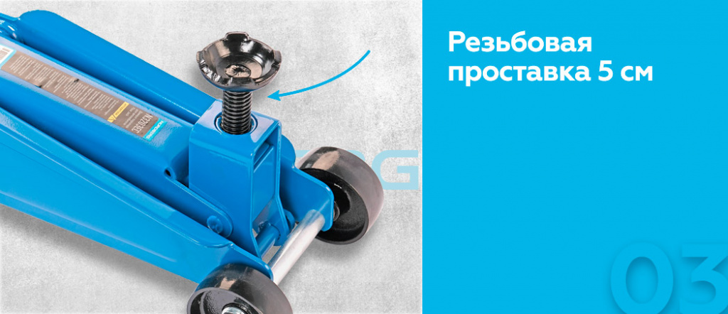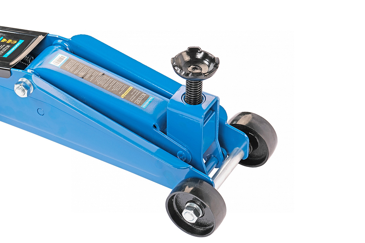 - Маневренные поворотные задние колеса (вращение 360°) облегчают перемещение домкрата по гаражу.
