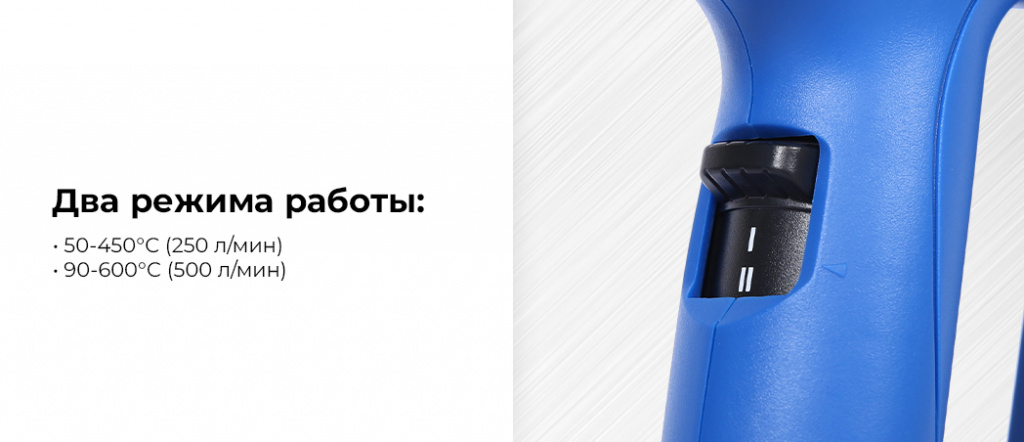 - Два режима подачи воздуха с регулировкой температуры: 1 режим 50-450 °С (250 л/мин), 2 режим 90-600 °С (500 л/мин)