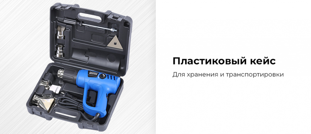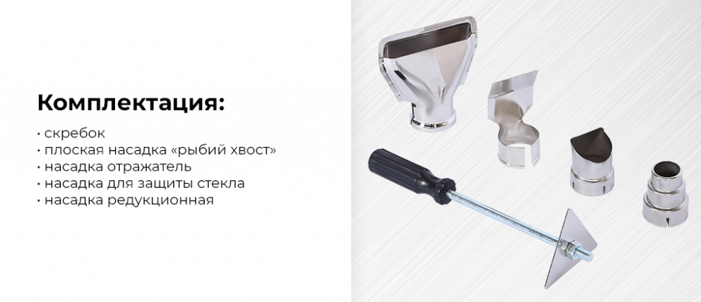 - Четыре насадки в комплекте: 1) отражатель для нагрева трубок, 2) редукционная для точечного нагрева, 3) для защиты стекла, 4) “рыбий хвост” для распределения горячего воздуха на большой площади