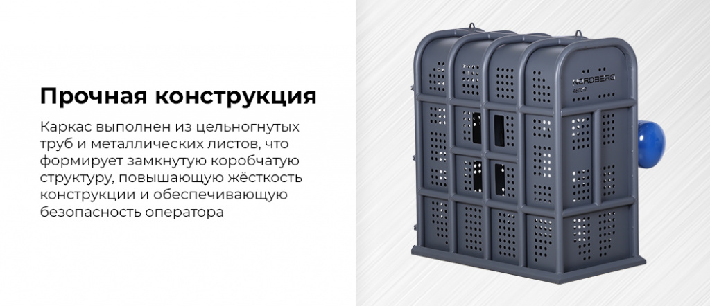 - Прочная конструкция — каркас выполнен из цельногнутых труб и металлических листов, что формирует замкнутую коробчатую структуру, повышающую жесткость конструкции и обеспечивающую безопасность оператора;