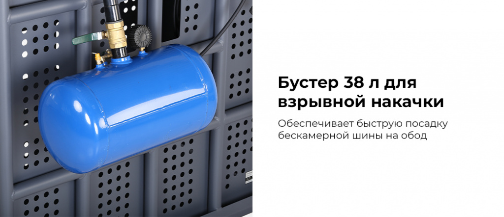 - Устройство для взрывной накачки (бустер) — переносной, крепится сбоку на кронштейнах, легко снимается и может использоваться отдельно. Обеспечивает быструю посадку бескамерной шины на обод;