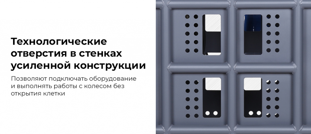 - Технологические отверстия в стенках усиленной конструкции — позволяют подключать оборудование и выполнять работы с колесом без открытия клетки;
