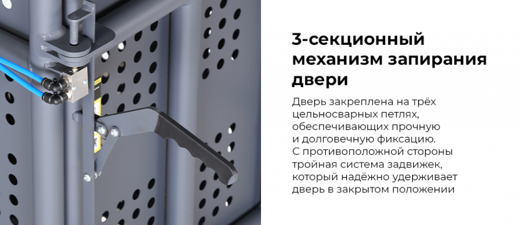 - Надёжный механизм запирания двери — с одной стороны дверь закреплена на трех цельносварных петлях, обеспечивающих прочную и долговечную фиксацию. С противоположной стороны расположены тройная система задвижек, который надежно удерживает дверь в закрытом положении;