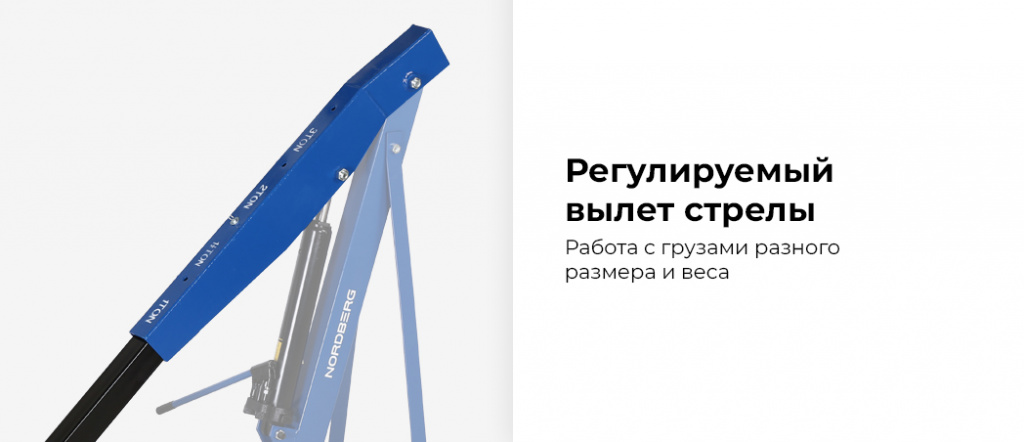 - Регулируемый вылет стрелы — позволяет работать с грузами разного размера и веса;