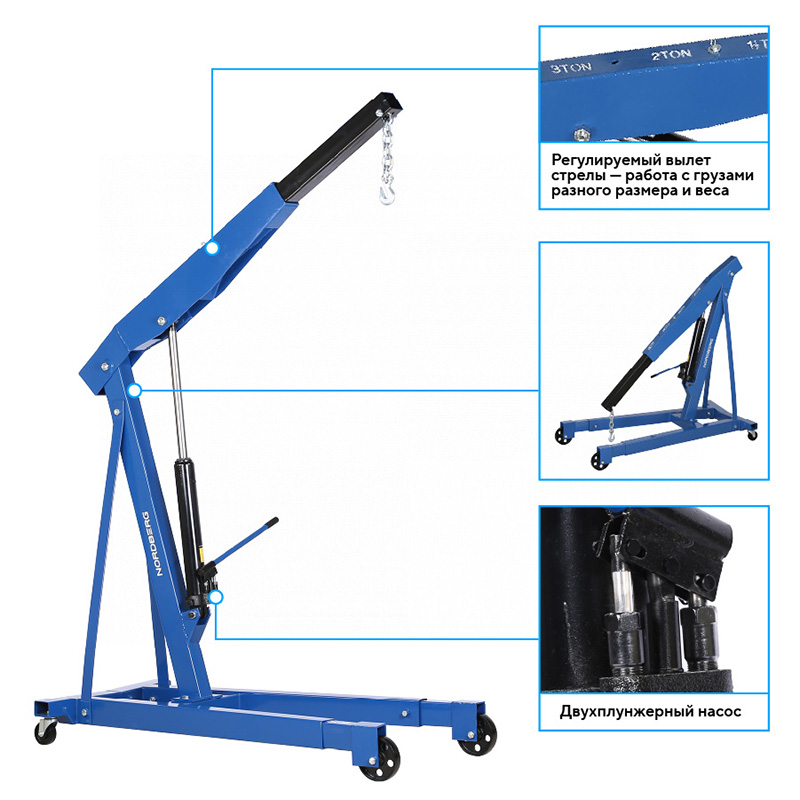 NORDBERG N3731 — предназначен для подъема и перемещения автомобильных узлов, агрегатов и других грузов массой до 3 тонн. Оснащен гидравлическим цилиндром с ручным управлением, обеспечивающим плавный подъем и опускание груза.