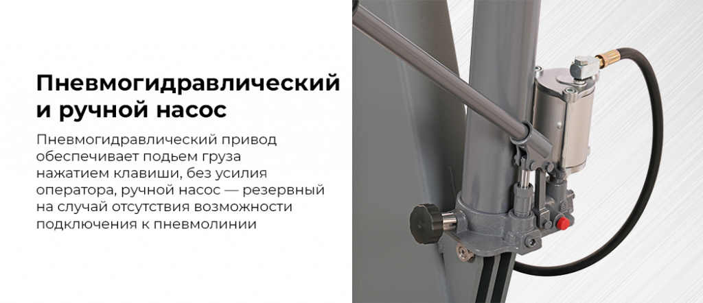 - Наличие высокоэффективного пневмогидравлического насоса и ручного гидравлического насоса одновременно.