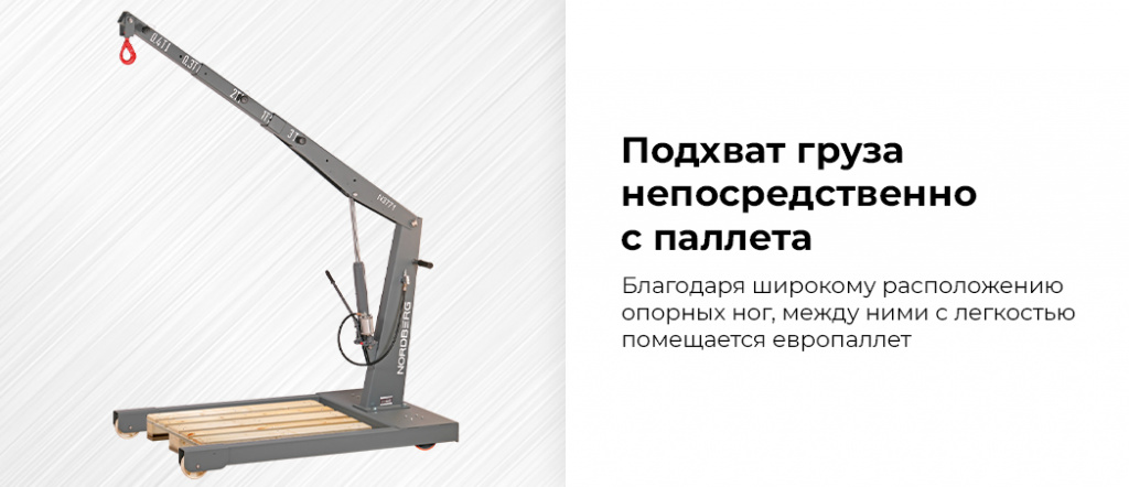 - Благодаря широкому расположению опорных ног крана, между ними с легкостью помещается европаллет, что позволяет осуществлять подхват груза непосредственно с паллета.