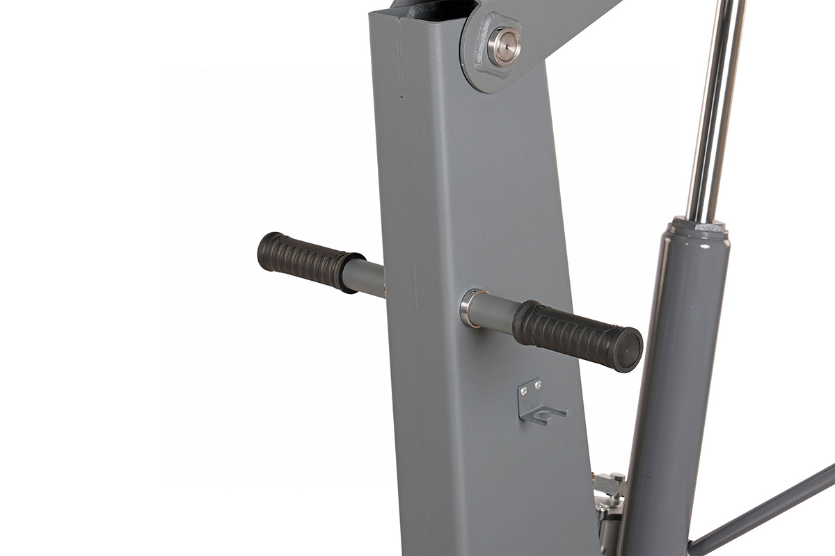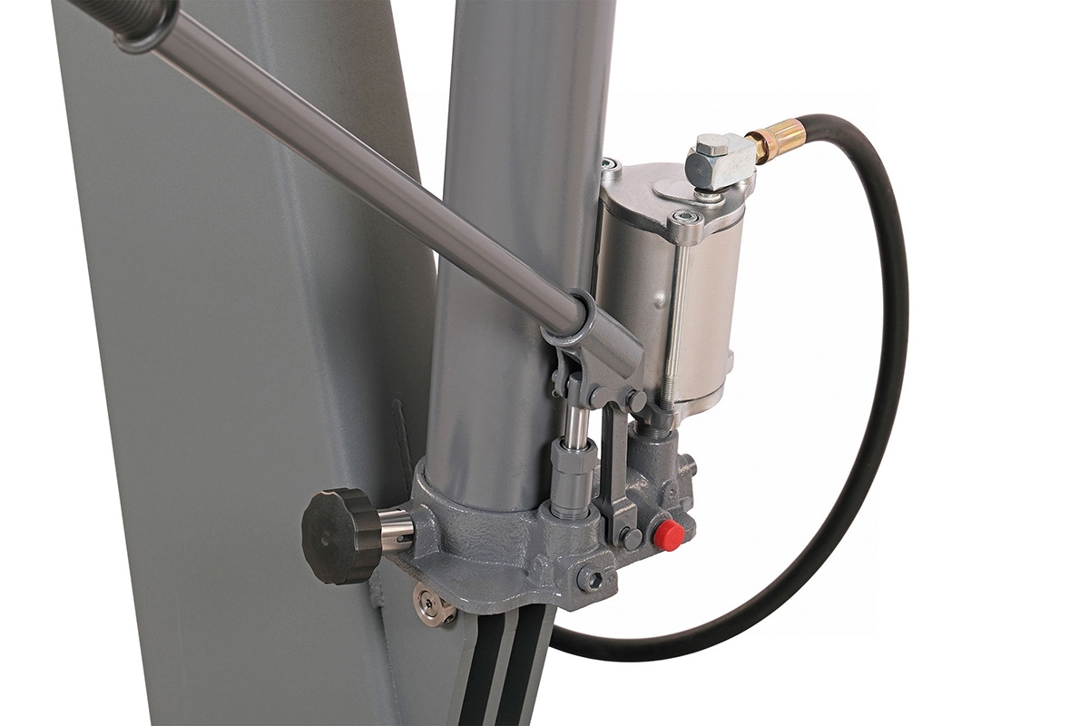 - Пневмогидравлический насос, работая на сжатом воздухе, позволяет увеличить скорость работы изделия в целом и облегчить работу оператора. При отсутствии возможности подключения сжатого воздуха, работа на изделии осуществляется за счет гидронасоса с ручным приводом движением рукоятки вверх-вниз.