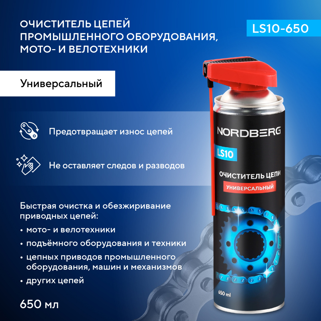 Очиститель NORDBERG LS10-650 быстро очищает и обезжиривает приводные цепи мото- и велотехники, подъемного оборудования, а также любые другие цепи, включая цепные приводы промышленных станков, машин и механизмов.