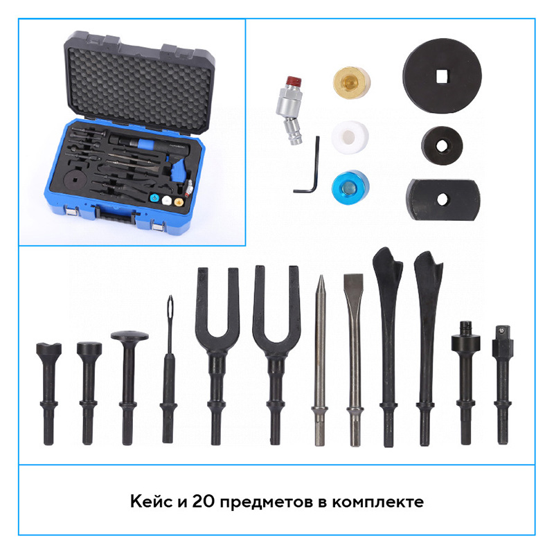 - Комплексная универсальность — в комплект входит 20 насадок и адаптеров для различных задач, включая молотки, пики, зубила, вилки для демонтажа и специализированные наконечники;