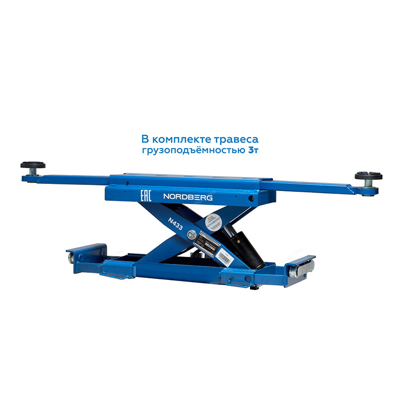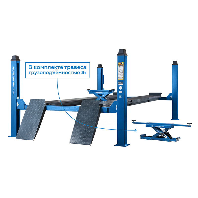 Надежный слесарный подъемник с увеличенной грузоподъемностью и удлиненной платформой Nordberg 4450 синего цвета, для сход-развала, c траверсой (от гидростанции) 3т.