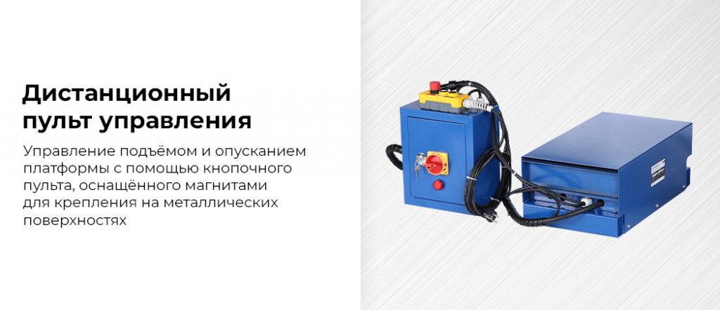 - Дистанционный пульт управления — удобное управление подъёмом и опусканием платформы с помощью кнопочного пульта, оснащенного магнитами для крепления на металлических поверхностях;