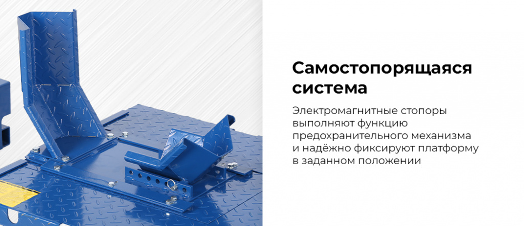 - Стопорная система — электромагнитные стопоры выполняют функцию предохранительного механизма и надежно фиксируют платформу в заданном положении;