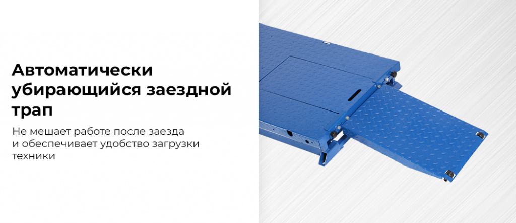 - Автоматически убирающийся заездной трап — не мешает работе после заезда и обеспечивает удобство загрузки техники;