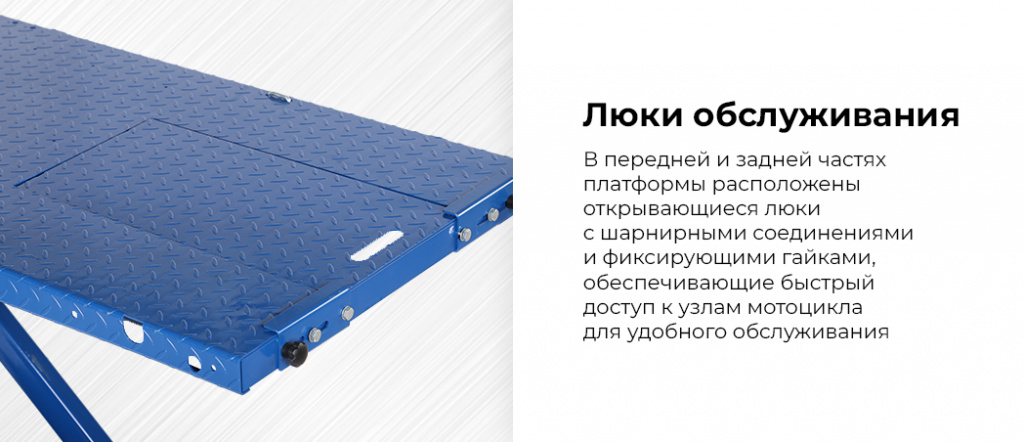 - Люки обслуживания — в передней и задней частях платформы расположены открывающиеся люки с шарнирными соединениями и фиксирующими гайками, обеспечивающие быстрый доступ к узлам мотоцикла для удобного обслуживания.