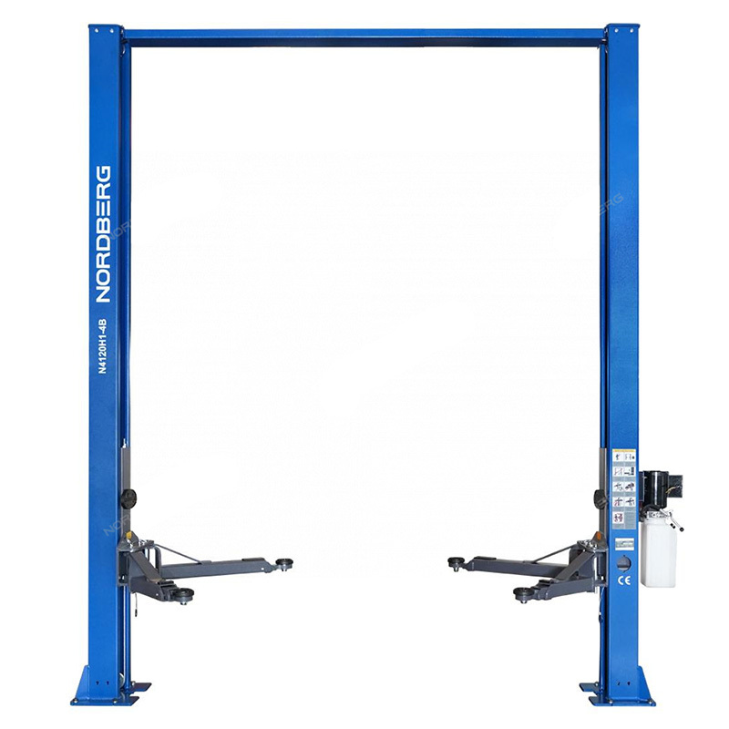 Двухстоечный подъемник NORDBERG N4120H1-4B_3+2 синего цвета с верхней синхронизацией предназначен для поднятия транспортного средства для выполнения работ по его техническому обслуживанию.