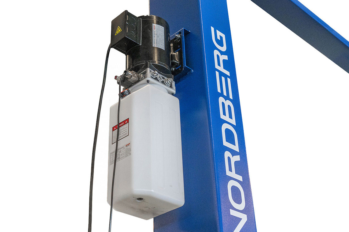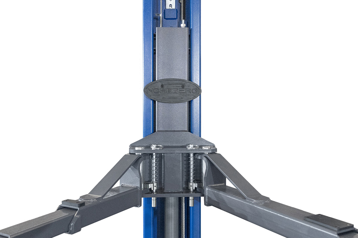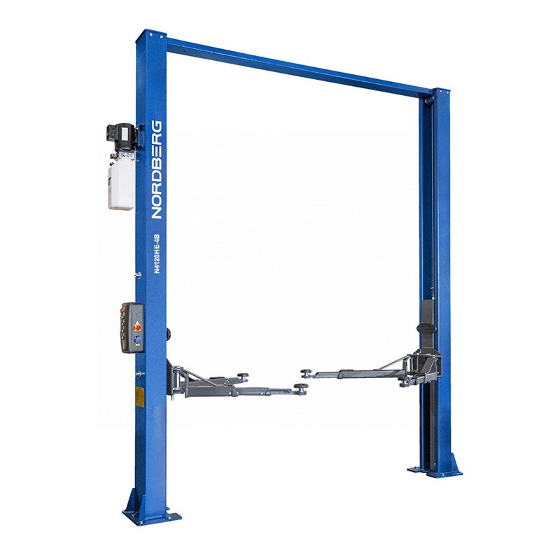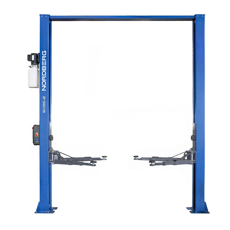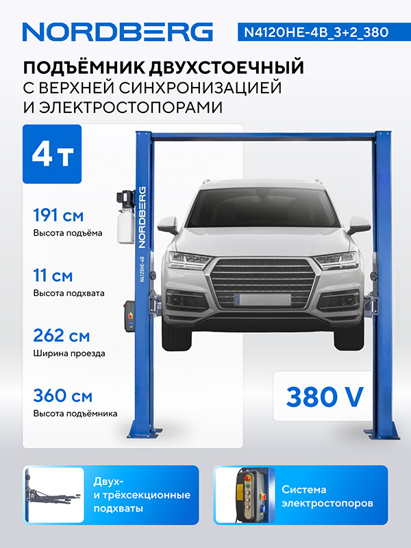 - NORDBERG (N4120HE-4B_3+2_380) Подъемник двухстоечный 4 т, верхняя синхронизация, с электростопорами, H=3,6 м, 380 В, синий