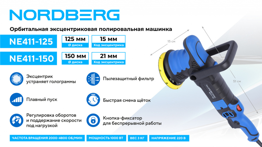 - NORDBERG (NE411-125) Полировальная машинка орбитальная, диск 125 мм, 2000-4800 об/мин