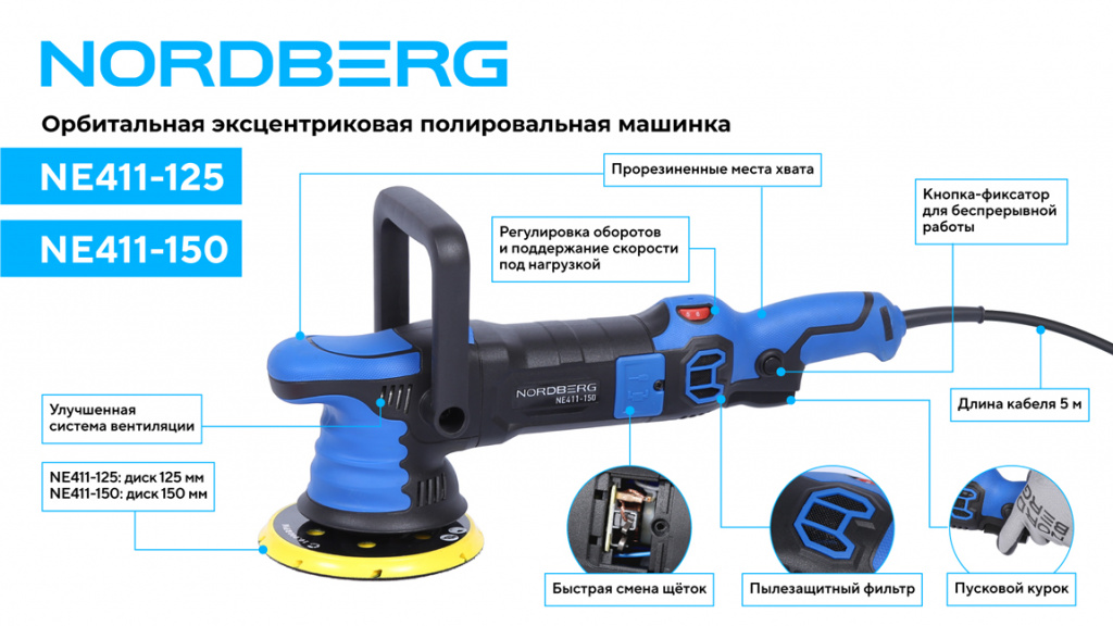 - NORDBERG (NE411-150) Полировальная машинка орбитальная, диск 150 мм, 2000-4800 об/мин