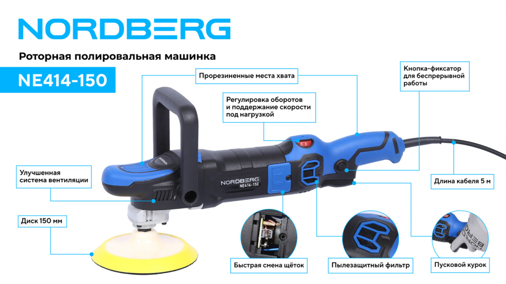 Полировальная машинка NORDBERG NE414-150 – электрический инструмент для выполнения профессиональных работ в автосервисах, студиях детейлинга и других предприятиях, занимающихся покраской. Предназначена для финишной полировки лакокрасочных покрытий автомобилей, а также для полировки различных материалов, таких как металл, пластик, дерево.