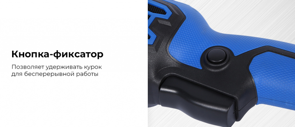 - Кнопка-фиксатор позволяет удерживать курок для беспрерывной работы.