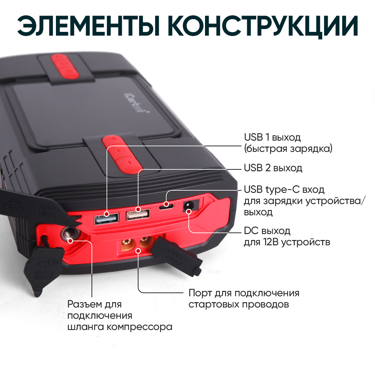2 USB-порта для зарядки и питания гаджетов, один из которых поддерживает режим быстрой зарядки, а также емкость 12 000 мАч позволят зарядить и/или запитать мобильные гаджеты. Устройство обладает выходом DC (12-16В/10A) для зарядки 12 В устройств с вилкой питания типа DC.