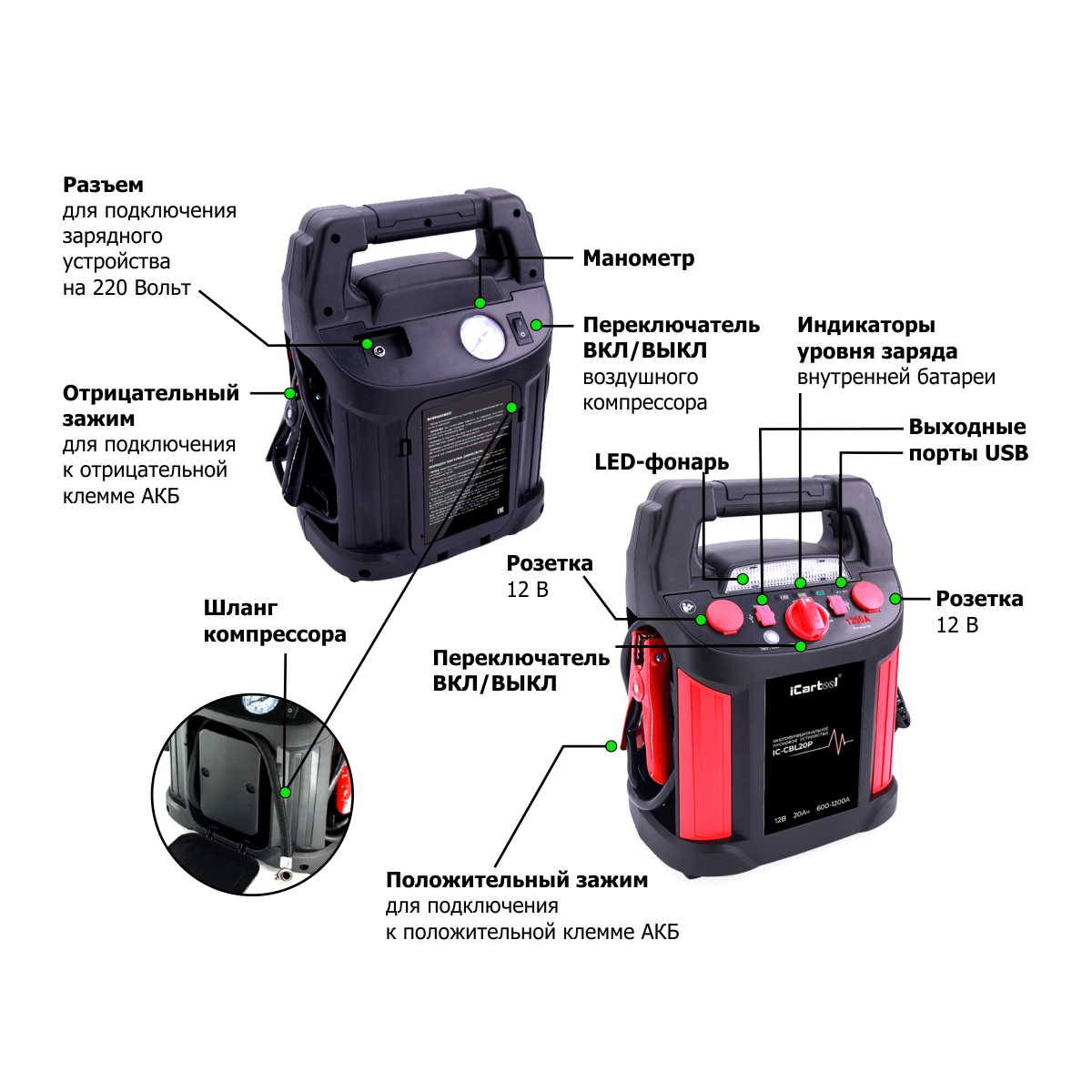 - iCartool (IC-CBL20P) Пусковое устройство с компрессором 12В, 20 000 мАч, 600/1200А