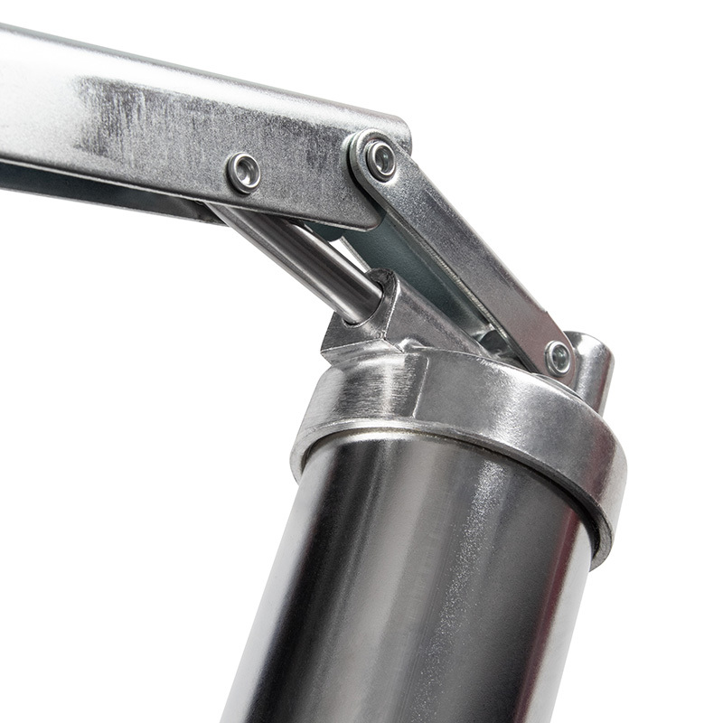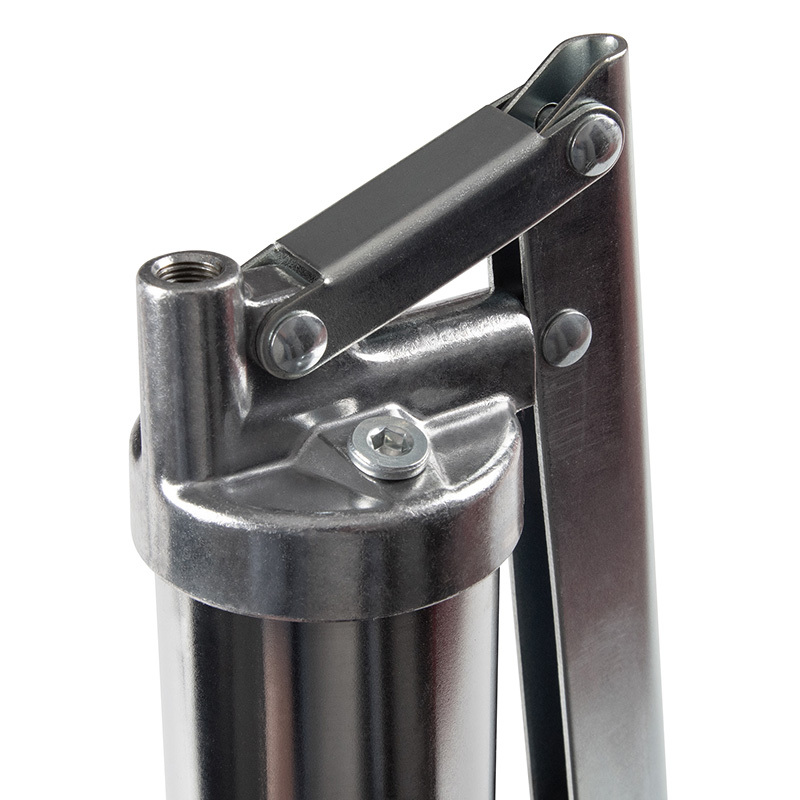 Материалы – алюминий (плунжерная головка), сталь (корпус, рукоять), ПВХ (защита рукояти), армированный нейлон (гибкий шланг)