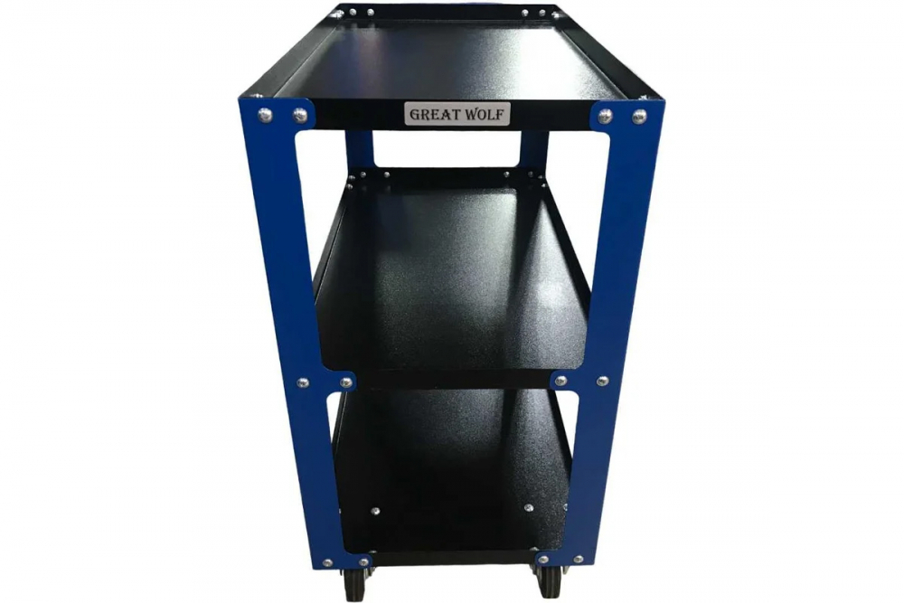 Инструментальная тележка Great Wolf GWT-B3 синего цвета открытая с тремя полками. Используется для хранения и транспортировки инструментов в автосервисах, гаражных мастерских, заводских и производственных цехах.