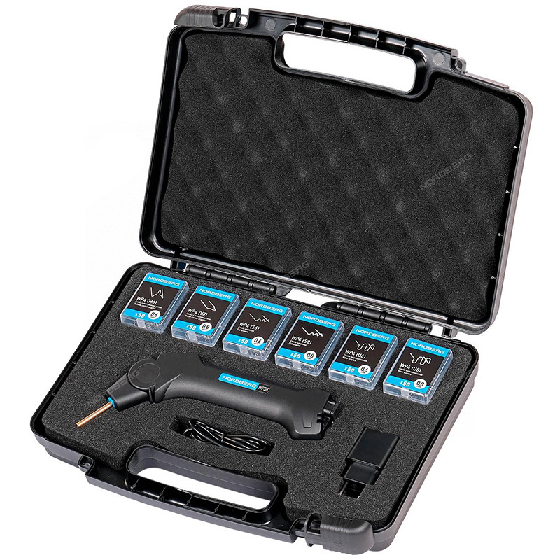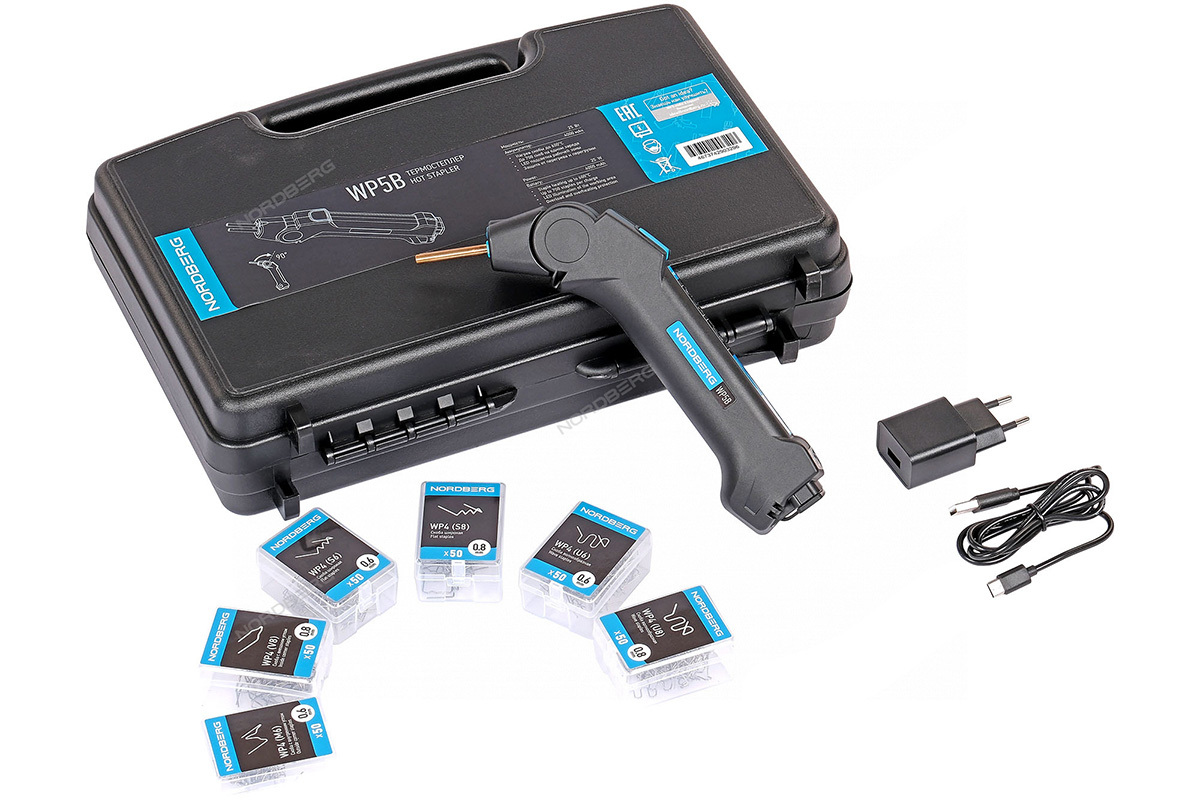 Аккумуляторный термостеплер NORDBERG WP5B в наборе со скобами используется в автомастерских, в гараже или на станциях технического обслуживания автотранспорта. Предназначен для ремонта пластиковых деталей путем армирования шва металлическими скобами, которые разогреваются и вводятся в пластик.