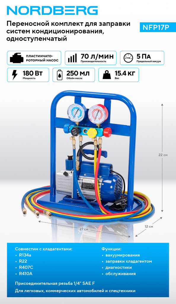 NORDBERG NFP17P — профессиональное оборудование для технического обслуживания автомобильных и стационарных систем кондиционирования и холодильных установок. Предназначен для вакуумирования, заправки хладагентом, а также диагностики и обслуживания систем кондиционирования. Совместим с хладагентами R134a, R22, R407C, R410A.