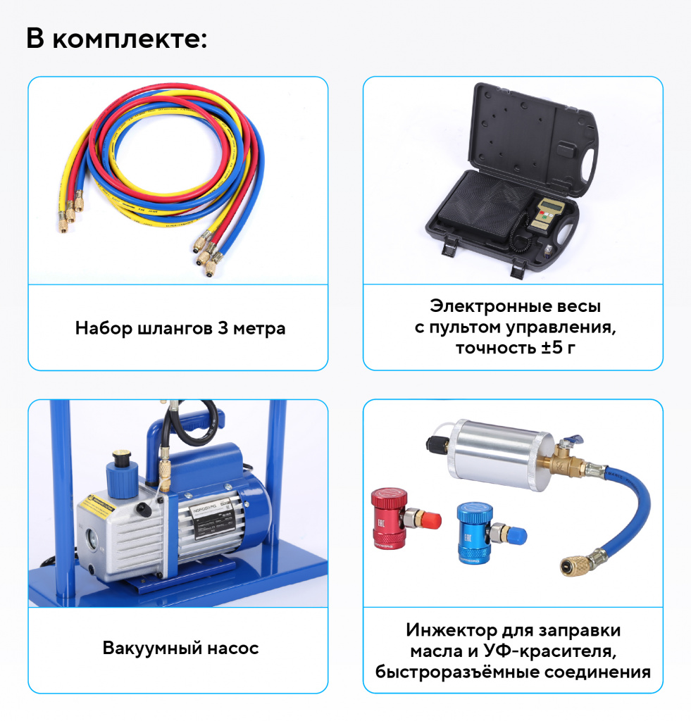 - Электронные весы — точная дозировка хладагента с погрешностью ±5 г;