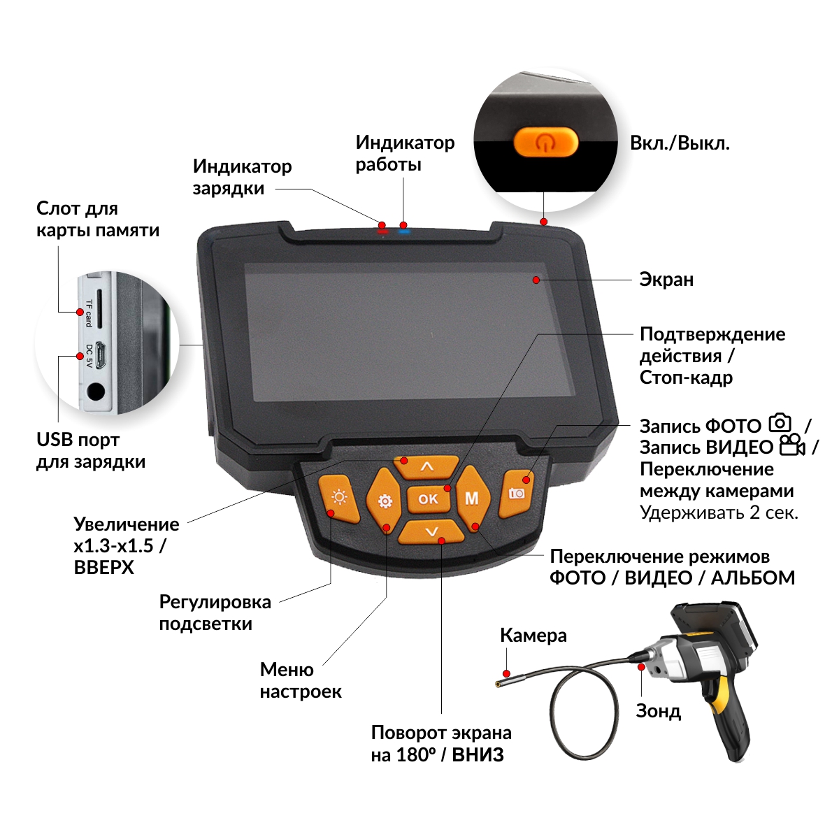 В комплект входит USB-кабель для зарядки, а также дополнительные насадки (крюк, магнит). Насадки крепятся к зонду при помощи резьбового соединения, что позволяет избежать падения насадок с зонда и расширяет возможности видеоэндоскопа (крюк для работы с электропроводкой, магнит для извлечения металлических предметов из труднодоступных мест). Для работы в плохо освещенных местах предусмотрена регулируемая LED подсветка с 3 режимами яркости. Встроенный аккумулятор поддерживает работу до 3 часов без подзарядки.