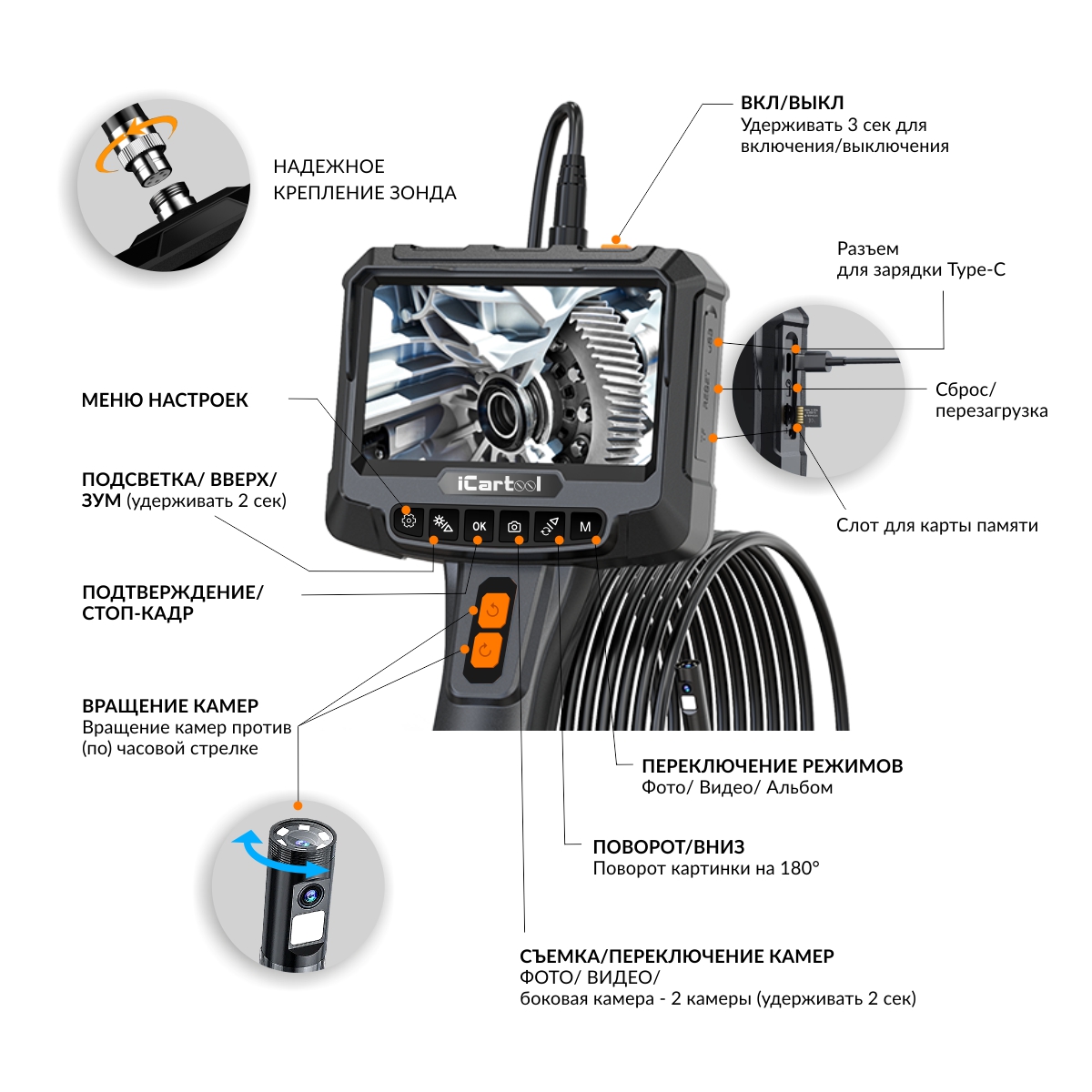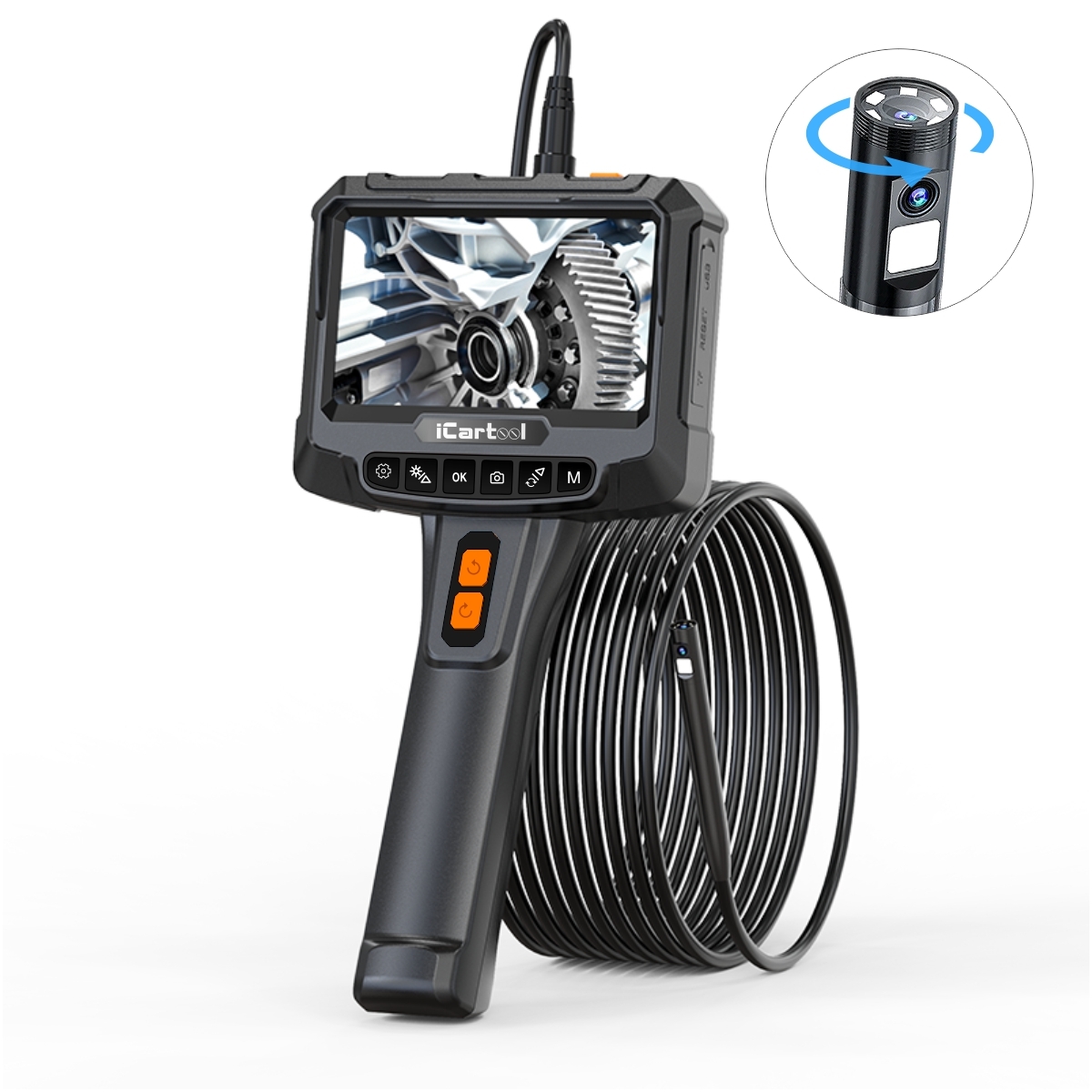 Промышленный видеоэндоскоп iCartool IC-VC700R имеет 2 камеры и экран с разрешением HD, матрицей IPS и диагональю 5”. Главная особенность видеоэндоскопа – возможность управлять положением боковой камеры, вращая её на угол до ±350 градусов для кругового обзора.