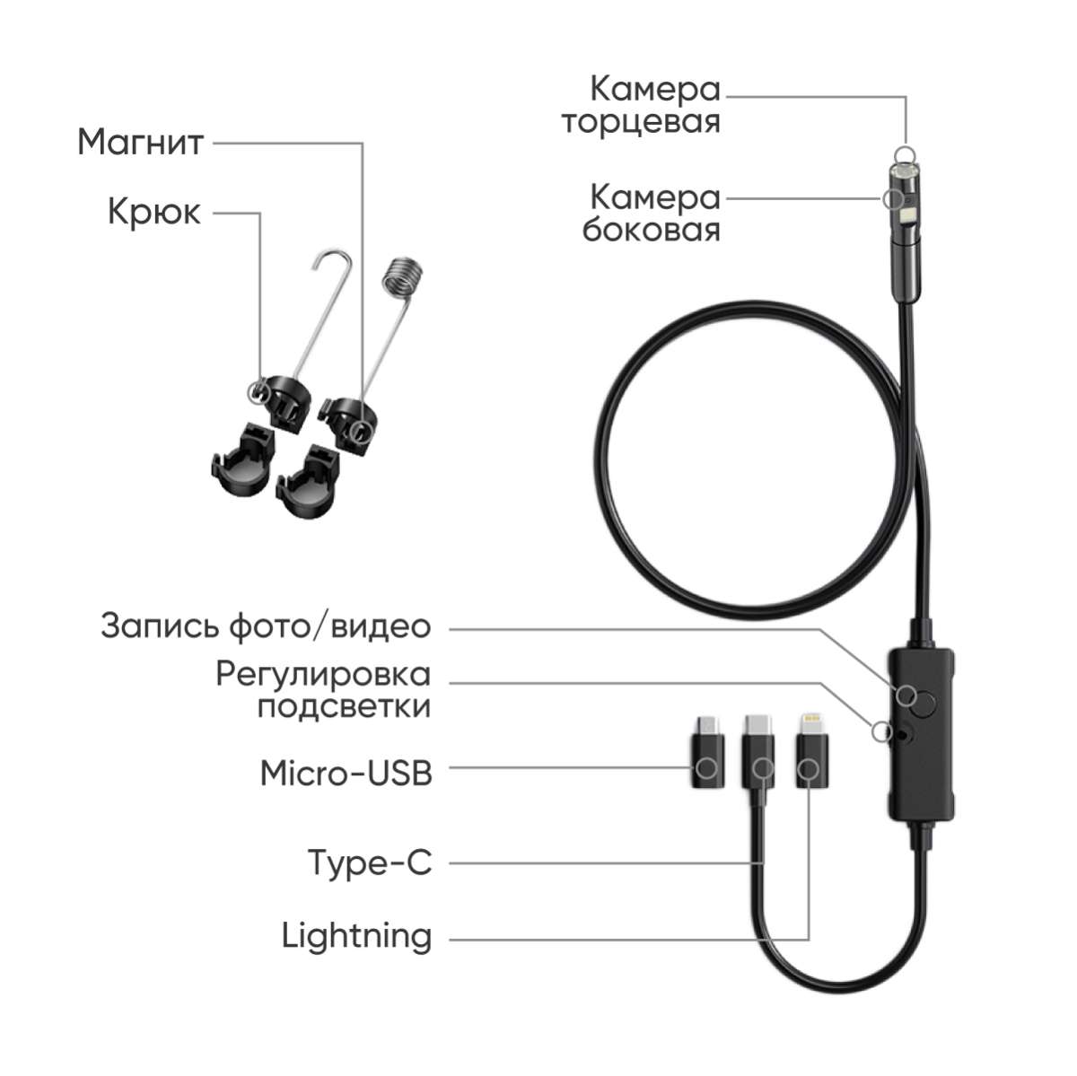Прибор оснащен разъемом USB Type-C и переходниками Lightning и Micro-USB, благодаря чему совместим почти со всеми смартфонами/планшетами на базе iOS/Android. Питание осуществляется за счет устройства, к которому подключен эндоскоп.