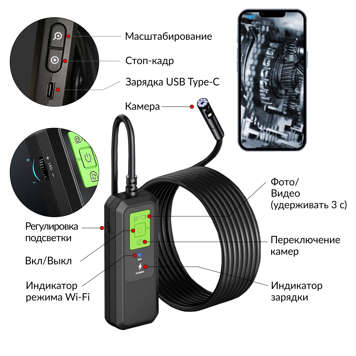 Зонд видеоэндоскопа полужесткий, запоминает форму, которую ему придают. Плавная регулировка светодиодной подсветки позволяет эффективно освещать исследуемую зону, обеспечивая отличную видимость в темных местах. Управление съемкой осуществляется через специальное приложение с расширенным функционалом, а основные команды дублируются кнопками на корпусе Wi-Fi модуля для удобства пользователя.